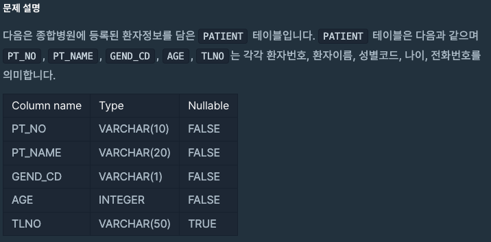 SELECT PT_NAME, PT_NO, GEND_CD, AGE, ifnull(TLNO, 'NONE') as TLNO from PATIENT