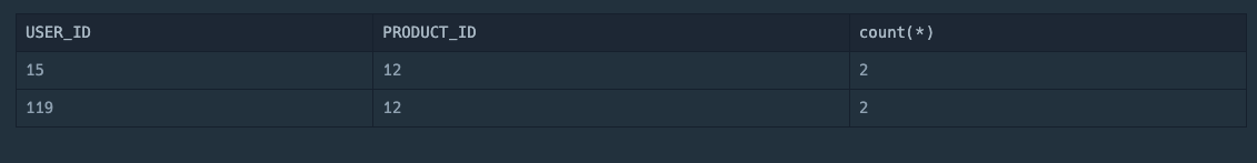SELECT USER_ID, PRODUCT_ID ,count() from ONLINE_SALE group by PRODUCT_ID, USER_ID having count() > 1