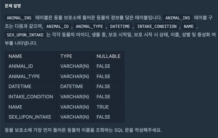 동물 보호소에 가장 먼저 들어온 동물의 이름을 조회하는 SQL 문을 작성해주세요.