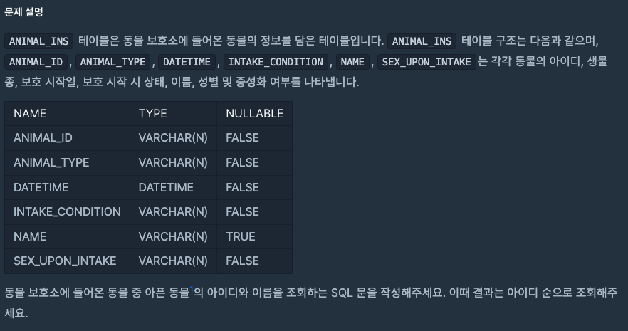 동물 보호소에 들어온 동물 중 아픈 동물1의 아이디와 이름을 조회하는 SQL 문을 작성해주세요. 이때 결과는 아이디 순으로 조회해주세요.