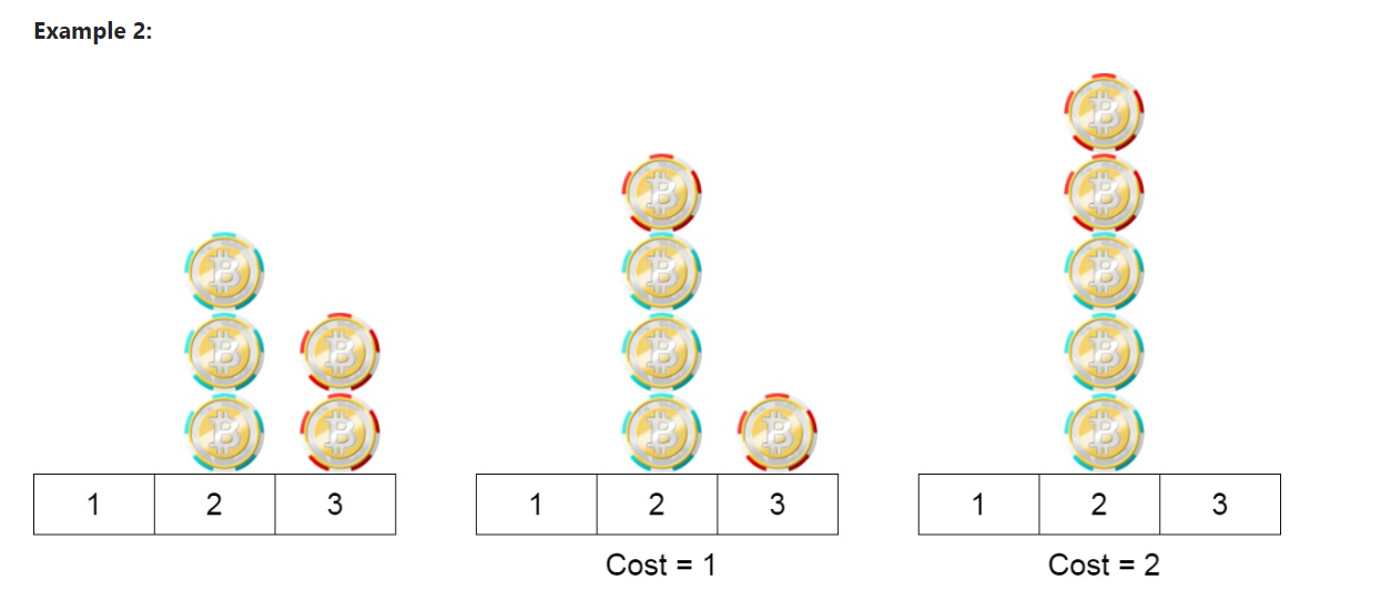Explanation: We can move the two chips at position 3 to position 2. Each move has cost = 1. The total cost = 2.