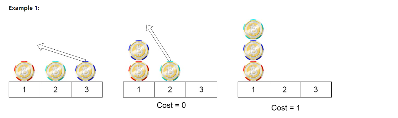 Explanation: First step: Move the chip at position 3 to position 1 with cost = 0.