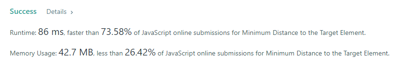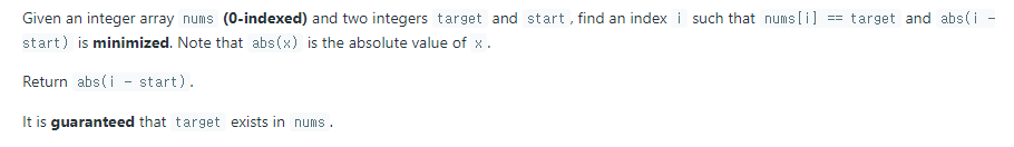 target의 값과 같은 nums 안의 요소의 index i를 찾고 i - start 의 절댓값의 최솟값을 리턴하는 문제이다.