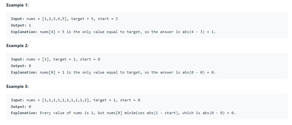 nums 안에는 target과 같은 숫자가 여러개 있을 수 있고 그 여러개의 index 중 start와의 차이의 절댓값이 가장 작은 값을 리턴해야한다.