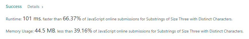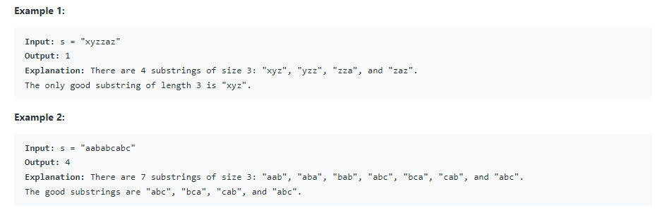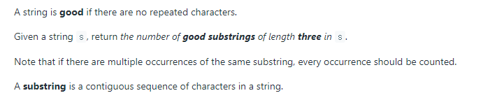 문자열 s가 주어지고 s의 길이가 3인 부분 문자열 중 good인 문자열의 갯수를 리턴하는 문제이다.