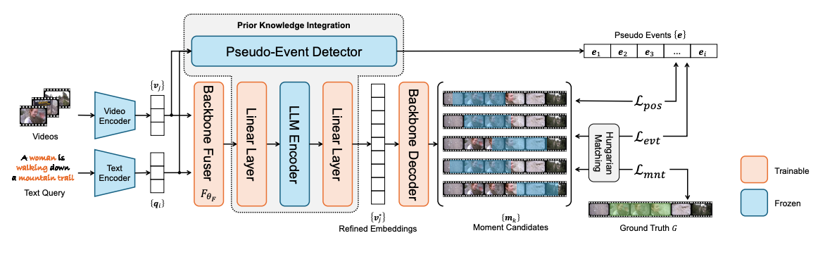 - 기존의 Moment-DETR 구조의 인코더 부분에서 Interaction 완료된 Video Feature가 나오면 그 후에, LLM을 한 번 더 거치는 식의 구조