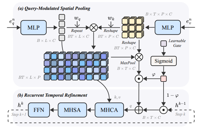- Recurrent하게 MHCA, MHSA, FFN 반복하며 비디오 피처 업데이트