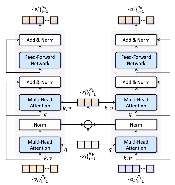 - zi에 Video, Audio Modality 정보 압축해서 섞은거 다시 확장해서 자기 modality로 가져가는 방식