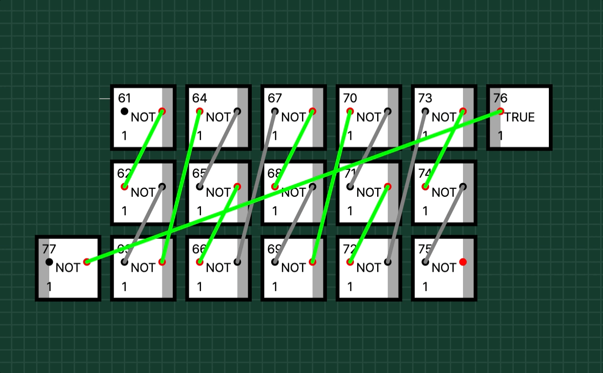 그림에서 보면 NOT 컴포넌트 15개가 연결된 환에 연결된 와이어들의 색과 완전히 켜진 상태(1)인 와이어의 색이 약간 차이를 보인다는 것을 알 수 있다.