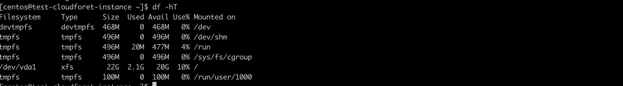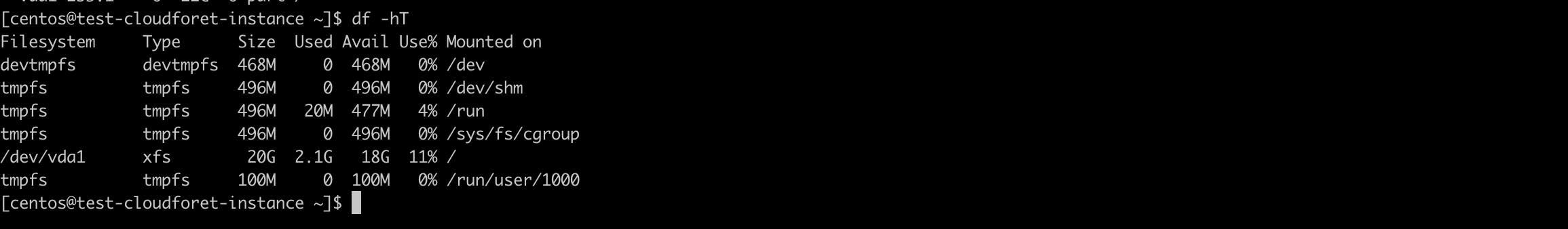하단을 보면 /dev/vda1(파티션)이 루트 경로에 마운트 되어있고 20G로 인식하고 있다는 것을 볼 수 있다. 파일 시스템은 xfs, ext4 등 용도에 따라 여러 종류의 파일 시스템이 존재하는데, 현재는 xfs 파일 시스템을 기준으로 확장해보겠다.