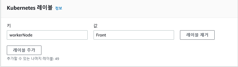 💡Nodegroup을 2개 생성시 Pod를 affinity사용해 각 어떤 노드 그룹에 생성할 것인지 명시 해야하기 때문에 NodeGroup 생성 과정에서 꼭 label을 추가해주어야 합니다.