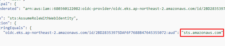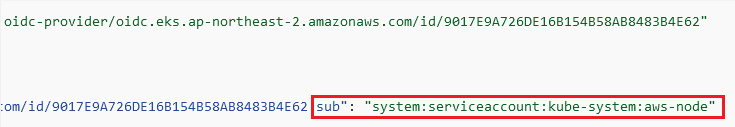 aud": "sts.amazonaws.com" → 아래꺼로 변경!! sub":"system:serviceaccount:kube-system:aws-node"