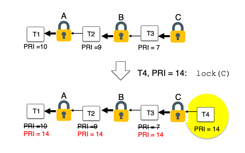 을 해결하기 위한 방법으로는priority inheritance protocol