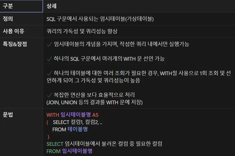 컬럼 2 ORDER BY 컬럼 3)컬럼 2별로컬럼 3 기준 줄 세우기컬럼 3 기준 상위 몇 %인지 출력N) OVER(PARTITION BY 컬럼 1 ORDER BY 컬럼 2)컬럼 1별로컬럼 2 순서대로 정렬했을 때N등분하여 순위 부여컬럼 1) OVER(PARTITION BY 컬럼 2 ORDER BY 컬럼 3)WITH 구문