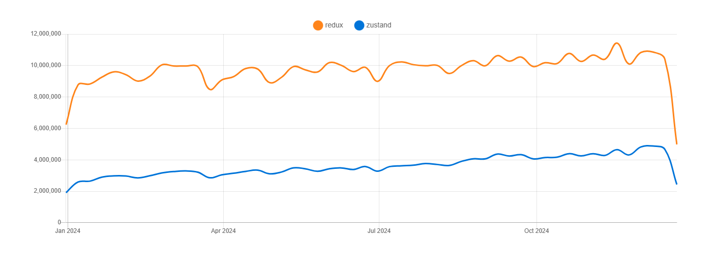 하지만 다른 상태 관리 라이브러리인 Redux가 여전히 압도적으로 많이 사용되고 있다. 다만 Redux는 문법이 복잡하고 학습 난이도가 높아 초보자들에게 진입장벽이 될 수 있다. 이런 이유로, 가볍고 사용이 간편한 Zustand가 요즘 많은 주목을 받고 있다고 한다.