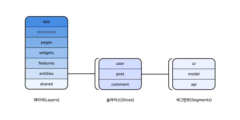 위 사진은 FSD를 검색했을 때 가장 먼저 나오는 대표적인 자료이다. 찾아보니 이 구조가 가장 정석적이며, FSD의 이상적인 형태라고 보는 것 같은데, 학교 선배님들의 프로젝트나 FSD를 적용한 친구들의 프로젝트를 살펴보면, entities, widgets, views(pages), shared 정도만 사용되는 경우가 많았다.