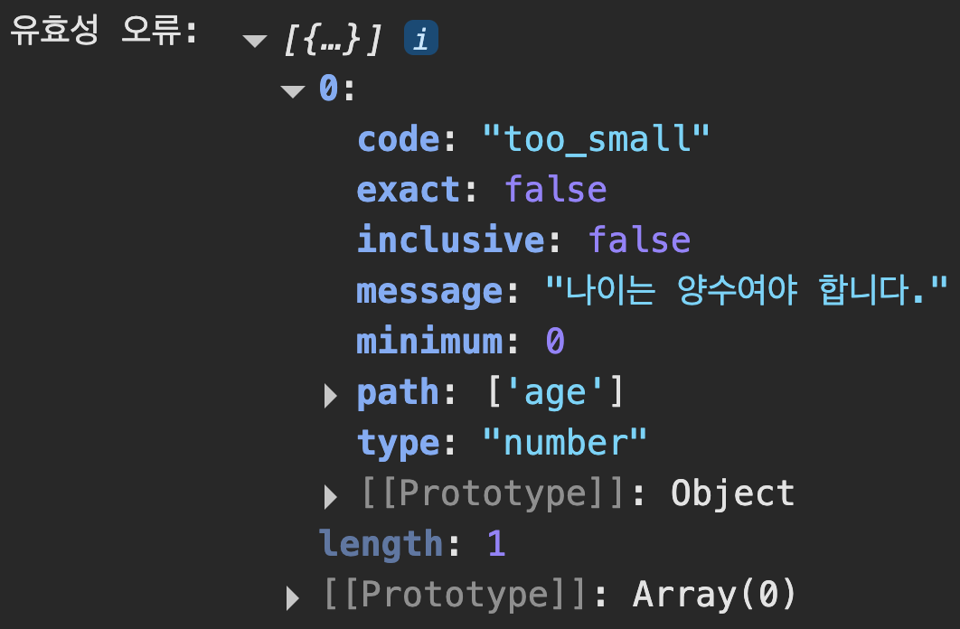 반대로 result.success가 false이면, "유효성 오류"라는 메시지와 함께 어떤 오류가 발생했는지 아주 자세한 정보가 출력된다.