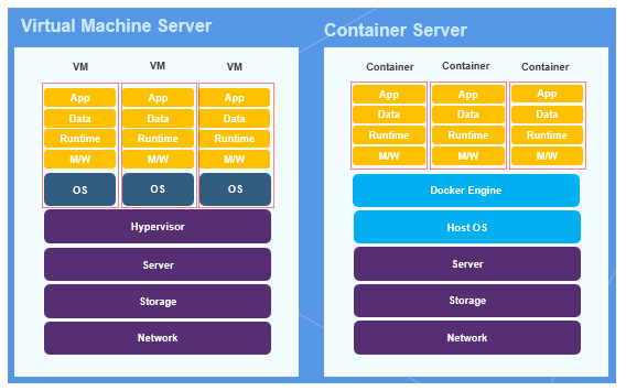 가상머신은 서버의 Hypervisor 위에 VM들을 올리는 반면에,