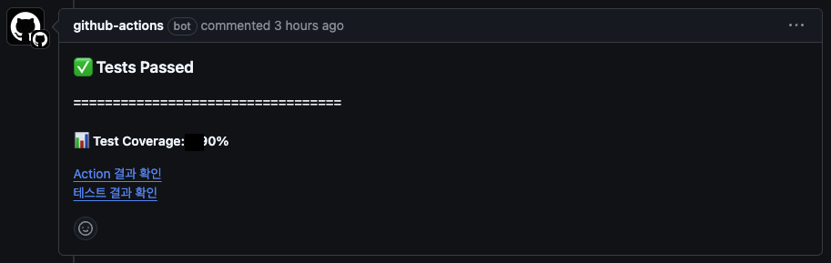 이후, 계산된 커버리지를 소수점 둘째 자리까지 포맷하여 가독성을 높이고, 이를 COVERAGE라는 환경 변수에 저장합니다. 이 환경 변수는 최종적으로 GitHub Comment Bot에서 활용되며, PR(풀 리퀘스트)에 테스트 커버리지 정보를 출력하는 데 사용됩니다.