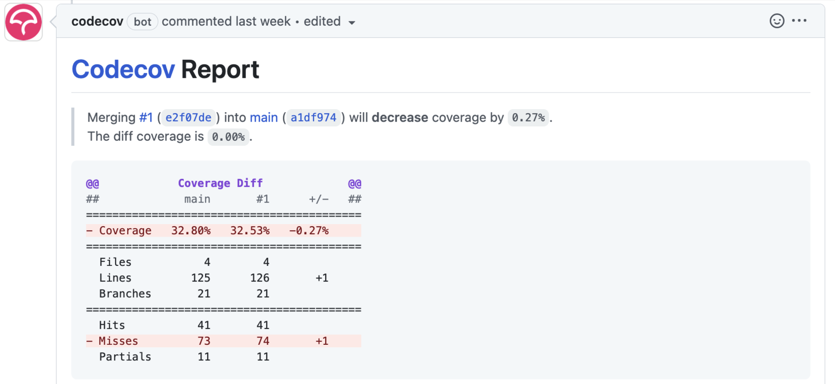 Codecov는 위에와 같은 파싱하고 깃허브 봇을 생성하는 작업을 귀찮게 설정할 필요없이 비교적 적은 workflow 작성으로 테스트 자동화 결과를 분석하고 리포트해주는 툴입니다.