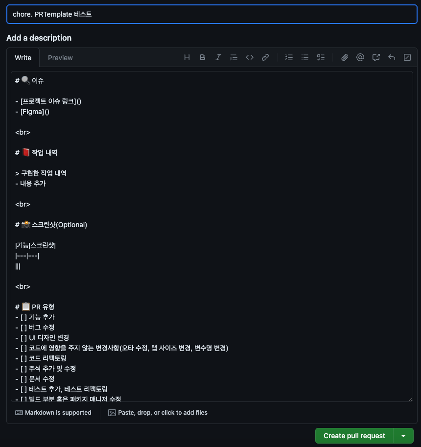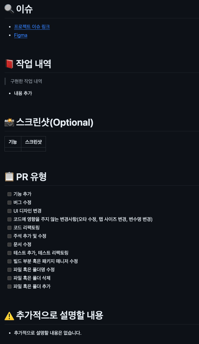 만들어 놓은 PR 템플릿이 제대로 적용되었다면 이렇게 나오게 됩니다.