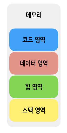 메모리는 Code, Data, Stack, Heap 4가지 영역으로 되어있다. Code 영역은 이름 그대로 코드, 프로그램의 명령어들이 저장되는 공간이다. 컴파일러에 의해 생성된 기계어 코드가 저장되고, 프로그램을 실행하면 코드를 한줄한줄 읽으면서 실행된다. Data 영역은 Static 영역이라고도 불리며 전역 변수와 정적 변수가 저장되는 공간이다. 프로그램의 시작부터 종료될 때까지 Data 영역에 저장된 전역, 정적 변수들은 사라지지 않고 메모리에 계속 살아있다. Stack 영역은 각종 함수와 관련된 매개변수, 지역변수, 복귀해야 할 주소 등이 저장된 공간이다. 함수가 종료되면 Stack 영역에 있는 데이터들은 사라지고 메모리에서도 회수된다. Stack 영역은 Last In First Out이기 때문에 마지막에 들어온 함수가 먼저 불리게 된다. 마지막으로 Heap 영역은 동적으로 할당된 객체들이 저장되는 공간이다. 객체를 new를 사용해서 생성하면, Heap 영역에 할당이 되고, 이때 객체 자체와 객체에 포함되는 변수들을 같이 저장하게 된다. 사용하지 않는 객체들은 GC(Garbage Collector)에 의해 Heap 영역에서 회수된다.