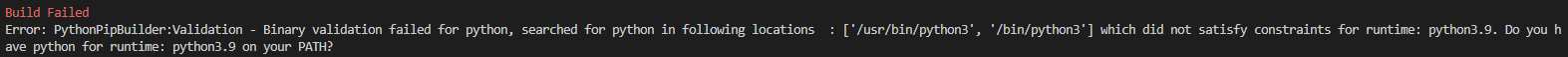 Error: PythonPipBuilder:Validation - Binary validation failed for python, searched for python in following locations : ['/usr/bin/python3', '/bin/python3'] which did not satisfy constraints for runtime: python3.9. Do you have python for runtime: python3.9 on your PATH?