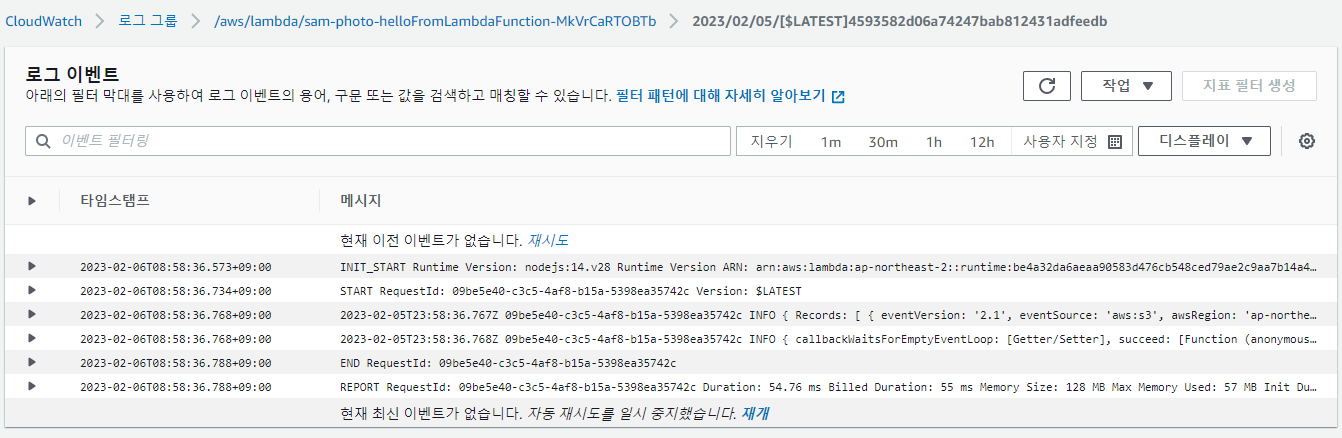 이제 해당 버킷에 jpeg 이미지를 하나 올리면, 람다 함수가 실행됩니다.