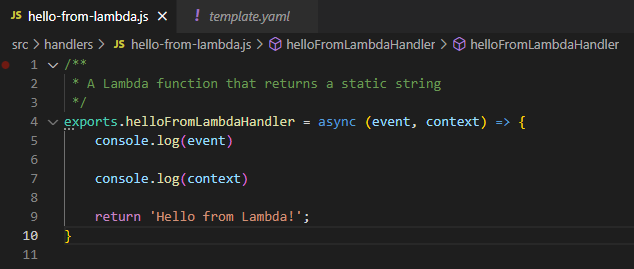 exports.helloFromLambdaHandler = async (event, context) => {