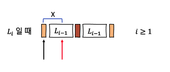 여기서 우리는 i-1 레벨의 햄버거의 길이가 X와 크거나 작은지, 같은지를 비교하고,