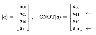 위의 회로에서, 아래의 상태에 대해 CNOT이 작동한다.