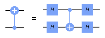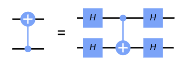 CNOT 게이트를 H 게이트들로 감쌈을 통해, CNOT 게이트가 반대 방향으로 적용되는 것과 동일한 행동을 수행하는 것을 알 수 있다.