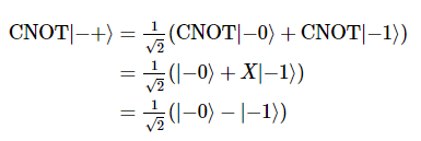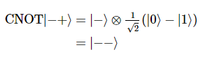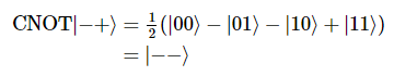 위 상태는 target 큐비트의 상태를 변화시키지 않은 상태를 유지(|-> 유지)하면서, control 큐비트의 상태에 영향을 끼친다(|+> -> |->).