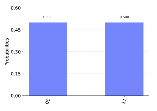 |00>로 측정될 확률이 50%, |11>로 측정될 확률이 50%이다.