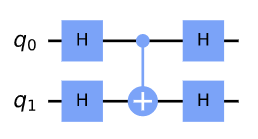 CNOT 게이트를 H 게이트로 감싸는 것은 큐비트의 기저를 계산 기저(∣0⟩, ∣1⟩)에서 (∣+⟩, ∣−⟩)으로 변환한다.