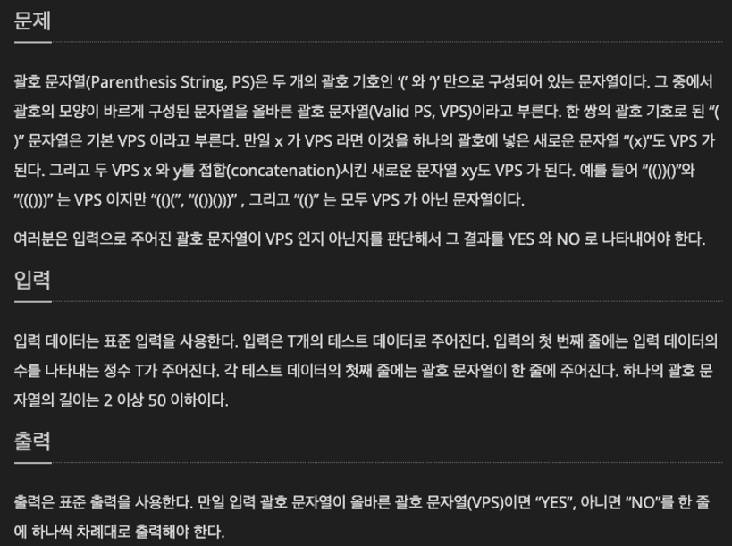 모든 과정을 끝낸 후 스택에 괄호가 남아있으면 올바르지 않은 괄호쌍. 남아있지 않으면 올바른 괄호쌍.