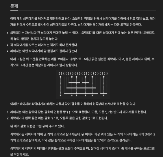 보통의 괄호문제에서 스택이 pop되는 시점에 있는 열린 괄호의 개수가 잘려진 쇠막대기의 개수가 된다는 사실을 알게됐다면 당신은 해당 문제를 쉽게 풀 수 있었을 것이다.