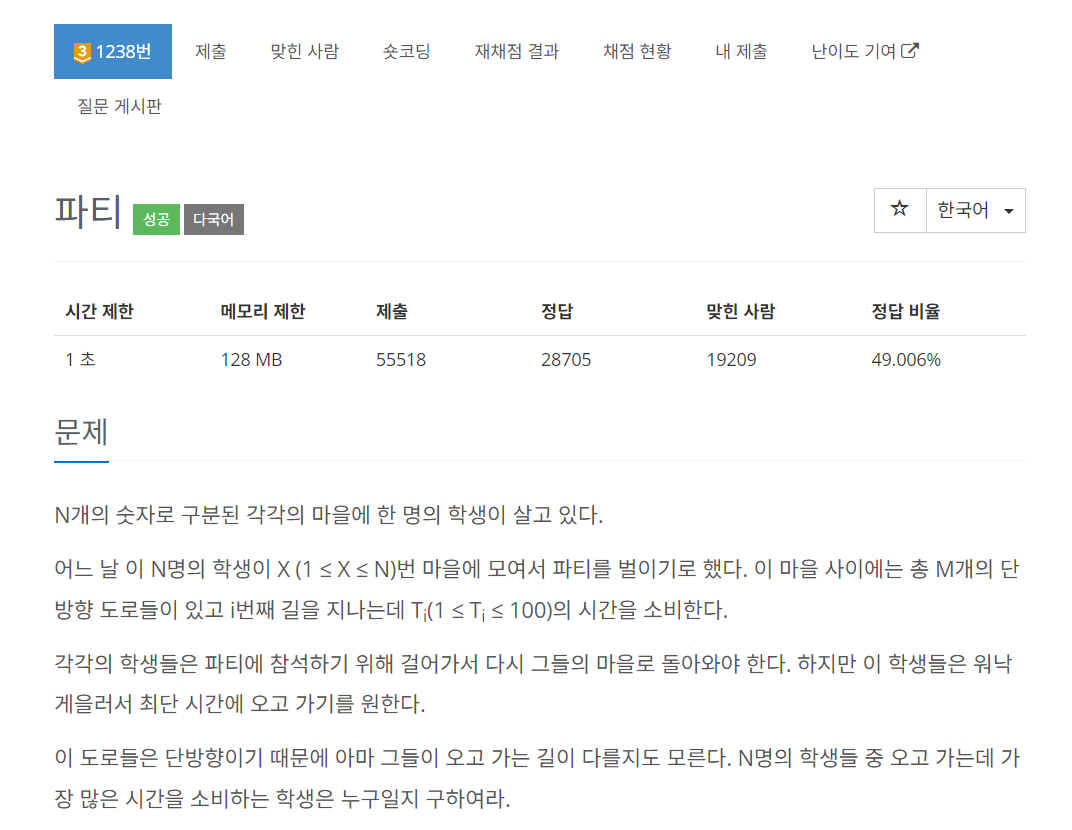 N개의 노드(마을)이 있다. 1번 부터 N개의 노드에 사람이 한명씩 산다. X노드에서 파티를 할 예정이고, 사람들은 각 노드에서 출발해서 X에서 파티를 하고 다시 자신의 노드로 돌아간다. 모든 사람들이 최단거리로 X에 갔다가 자신의 노드로 돌아올 것이다. 이번 문제는 이중에서 가장 최단거리로 가도 먼 거리가 얼마인지 출력하는 것이다.