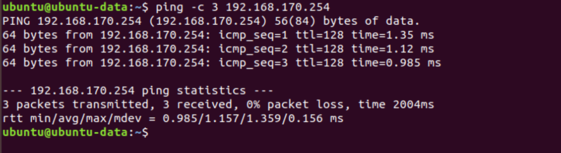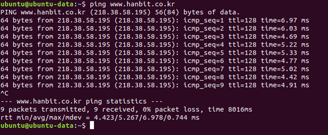 -c 옵션으로 보낼 패킷수를 지정하지 않으면 Ctrl+c 로 ping을 종료시켜야 하며, ping이 종료되면 위와 같이 정보가 출력된다.