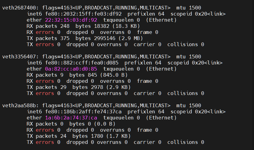 컨테이너를 실행시키게 된다면 다음과 같이 기본적으로 IP를 할당받고, docker0 과 연결 다리인 가상 이더넷이 형성된다.
