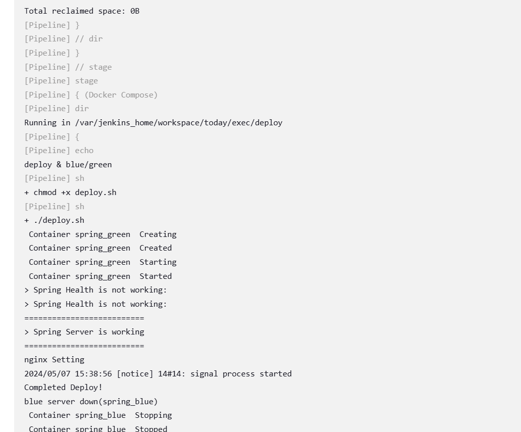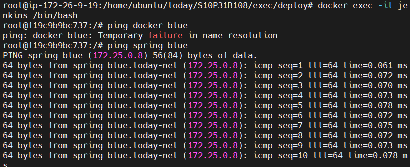 젠킨스 내부에서의 ping 을 확인해보면 정상적으로 DNS를 통해 스프링 블루가 인식되는걸 확인할수 있다