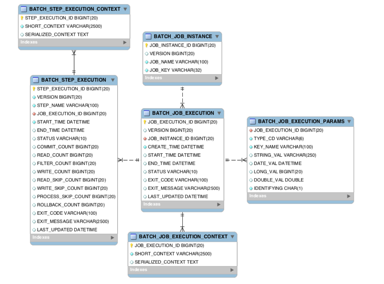 Spring Batch를 등록하면 다음과 같은 테이블들이 자동 생성되고 해당 Repository에 Batch의 동작을 기록해놓는다.