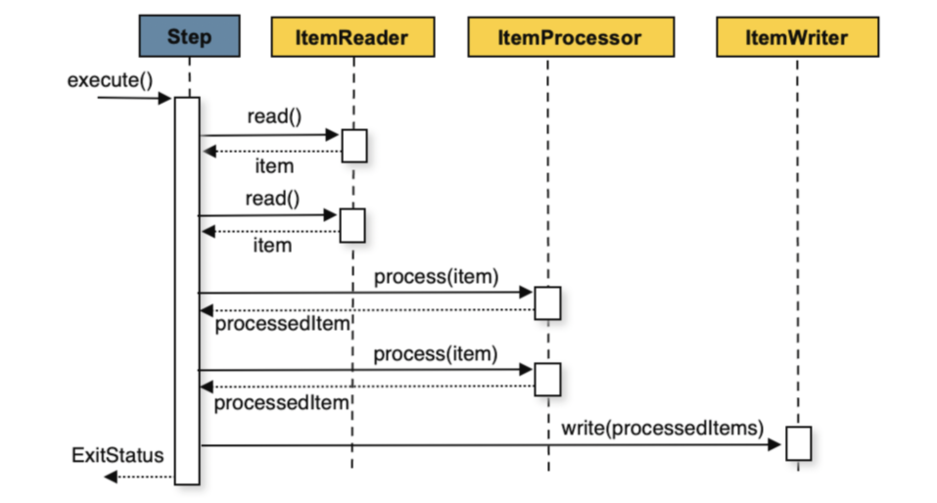Reader에서 데이터를 하나 읽어온뒤, Processor에서 가공하고,데이터들을 별도의 공간에 모은 뒤, Chunk단위만큼 쌓이게 되면 Writer에 전달하고 Writer는 일괄 저장한다고 한다.