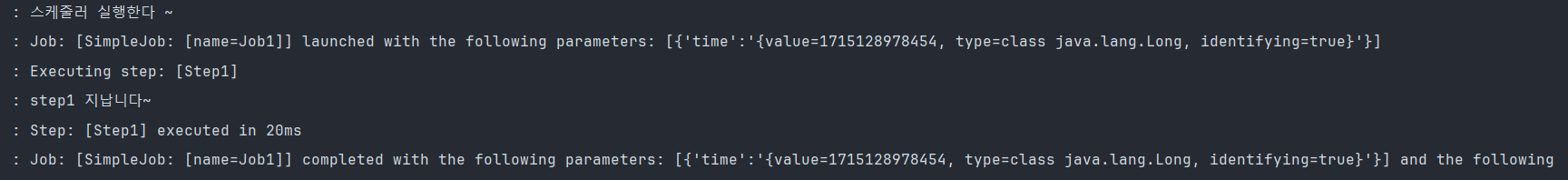Tasklet: Tasklet은 실제 비즈니스 로직을 수행하는 단위로, 여기서는 로그를 출력하는 간단한 로직을 포함하고 있습니다. Tasklet은 RepeatStatus.FINISHED를 반환하여 작업의 완료를 알립니다.
