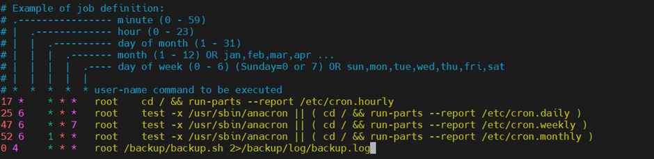 0 4 * * * root /backup/backup.sh 2>/backup/log/backup.log