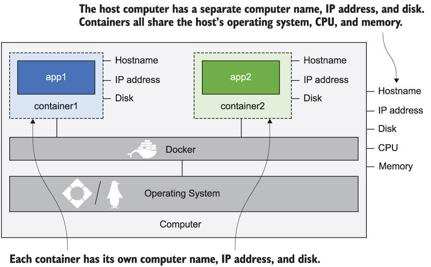 컨테이너 내부의 앱은 외부를 볼 수 없지만 컨테이너는 한 컴퓨터에서 실행하며 컴퓨터는 여러개의 컨테이너를 실행할 수 있다.
