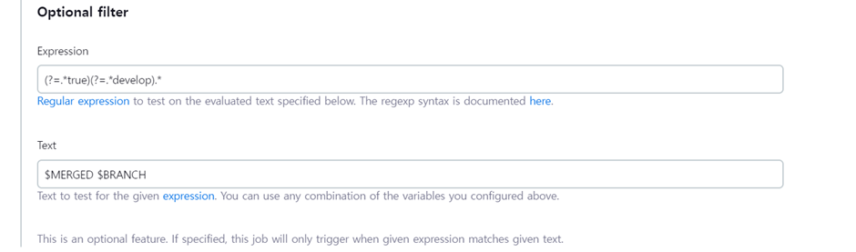 merge가 true이고, 브랜치가 develop인 작업에 대해 트리거를 수행하는 것이다.