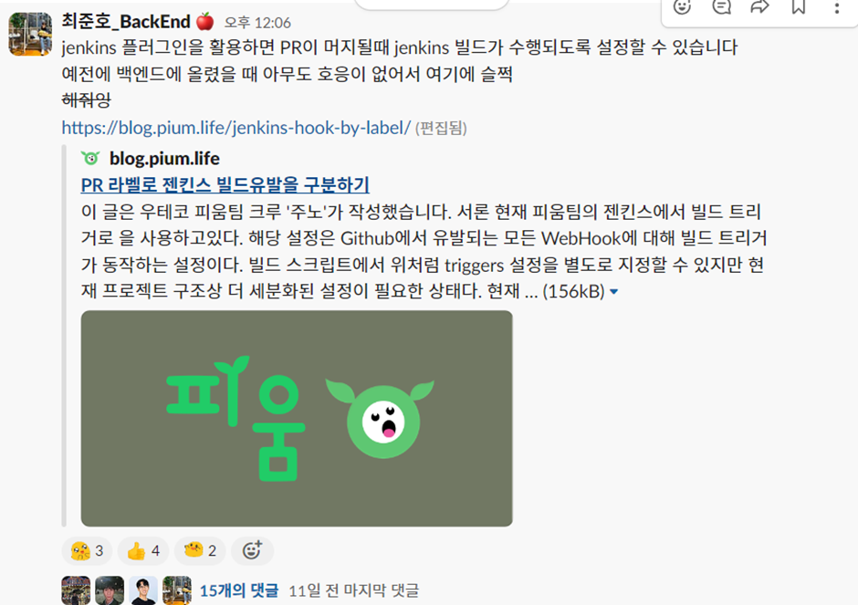 이전에 다른 프로젝트에서 Github Webhook을 이용하여 자동빌드를 경험해본 팀원의 도움을 받아 적용을 하게 되었다.