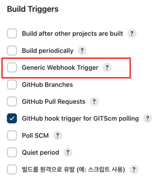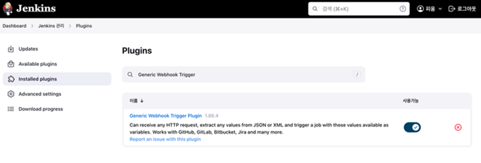 Generic Webhook Trigger는 젠킨스에서 제공하는 플러그인으로 HTTP요청을 수신하여 JSON, XML 형태의 데이터를 추출하여 트리거를 지정할 수 있는 플러그인이다.