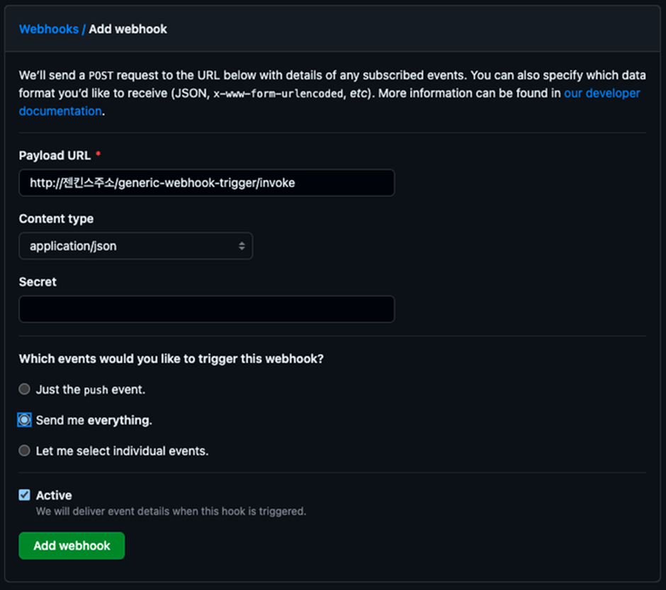 위 설정에 맞춰 Github에서 Webhook설정을 변경해주자.
